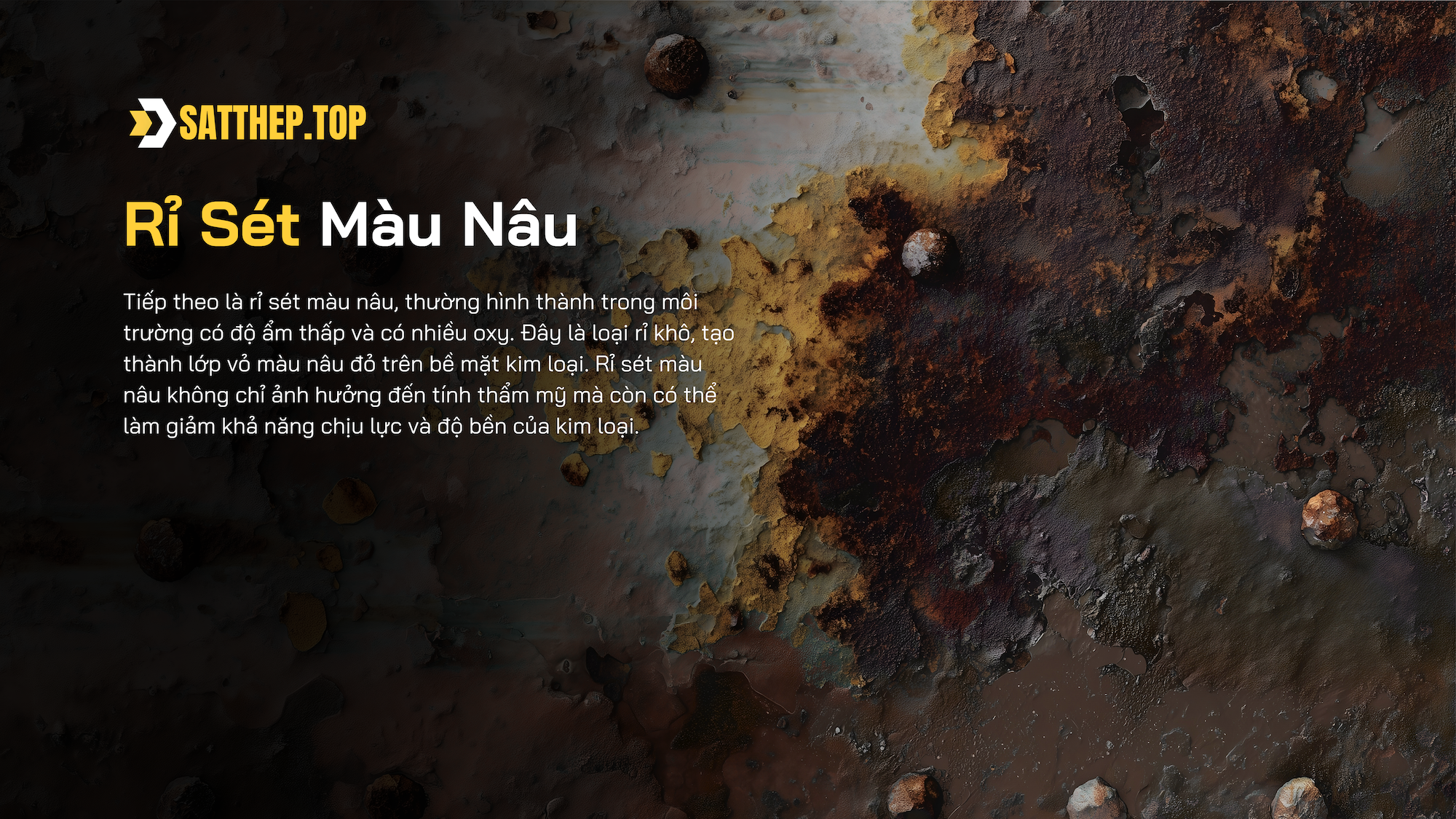 Rỉ sét màu nâu: Hình thành trong môi trường có oxy nhưng độ ẩm thấp hơn. Đây là loại rỉ khô và thường tạo thành một lớp vỏ không đồng đều